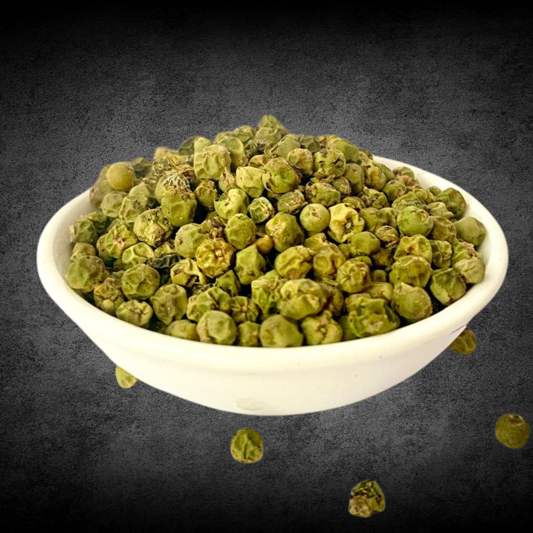 Machine-Dried Green Peppercorns from Ceylon. Zesty, herbaceous, and perfect for dishes demanding brightness without harsh heat. Excels in soups, sauces, and salads. FOB $21.00/Kg.